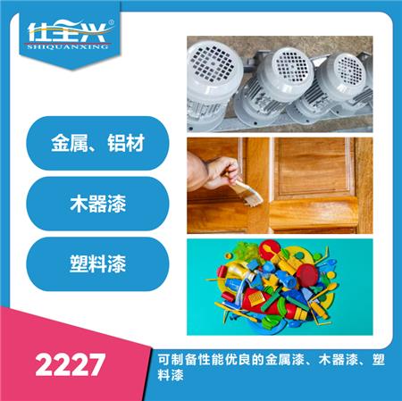 2227聚酯聚丙烯酸酯分散体,用于制备高温条件下具有较高耐黄变性能的烘干工业涂料。还可用于制备塑料用双组份聚氨酯表面涂层和底漆。树脂具有良好的颜料润湿性及剪切稳定。硬度好,柔韧性好,漆膜通透丰满,耐老化优异,搭配聚氨酯固化剂或氨基树脂用于各种金属,塑料,地坪漆的双组份漆或氨基烤漆特别是应用于铝材提升附着力。