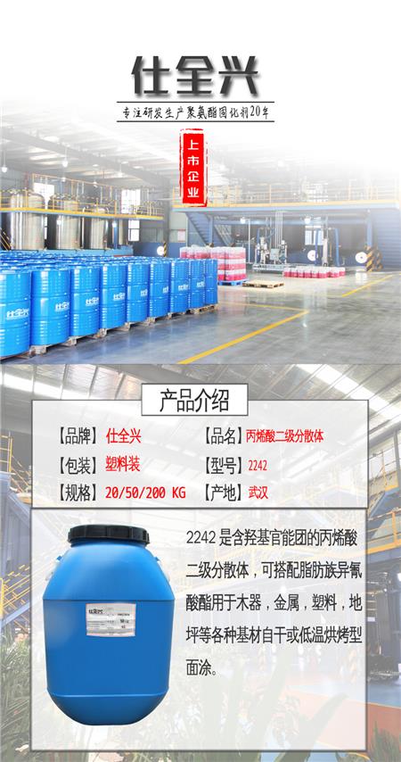 2242是含羟基官能团的丙烯酸二级分散体,可搭配脂肪族异氰酸酯用于木器,金属,塑料,地坪等各种基材自干或低温烘烤型面涂。