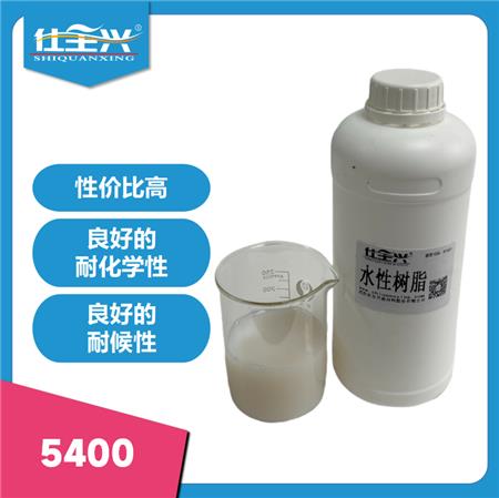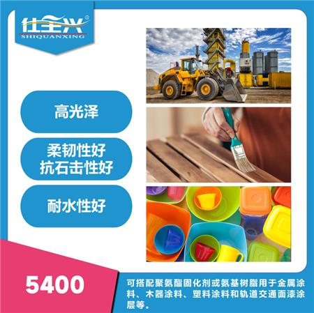 5400是一款羟基丙烯酸乳液。本产品光泽高,柔韧性好,抗石击性好,具有良好的耐化学性和耐候性。可搭配聚氨酯固化剂或氨基树脂用于金属涂料、木器涂料、塑料涂料和轨道交通面漆涂层等。