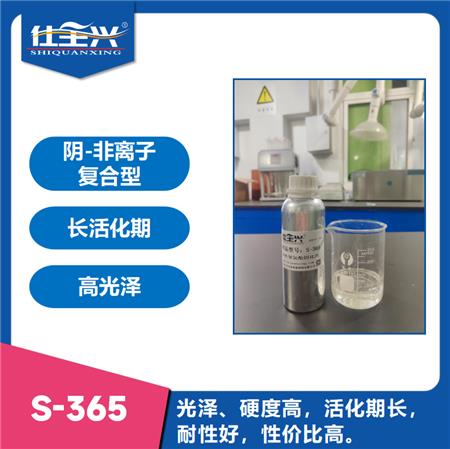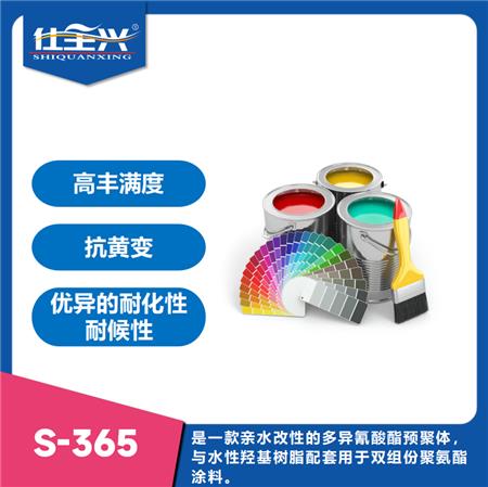 S-365是一款亲水改性的多异氰酸酯预聚体,通用性强,100%固含,环保无溶剂。与水性羟基树脂配套用于双组份聚氨酯涂料,具有较长的活化期,漆膜具有高光泽、高丰满度、抗黄变、并具有优异的耐化性和机械性能。